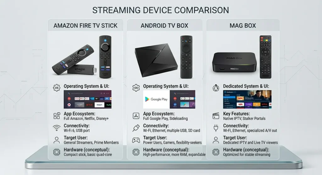 Firestick is best for affordability and ease of use, Android TV boxes offer better performance and flexibility, while MAG boxes are best for stable, dedicated IPTV streaming.