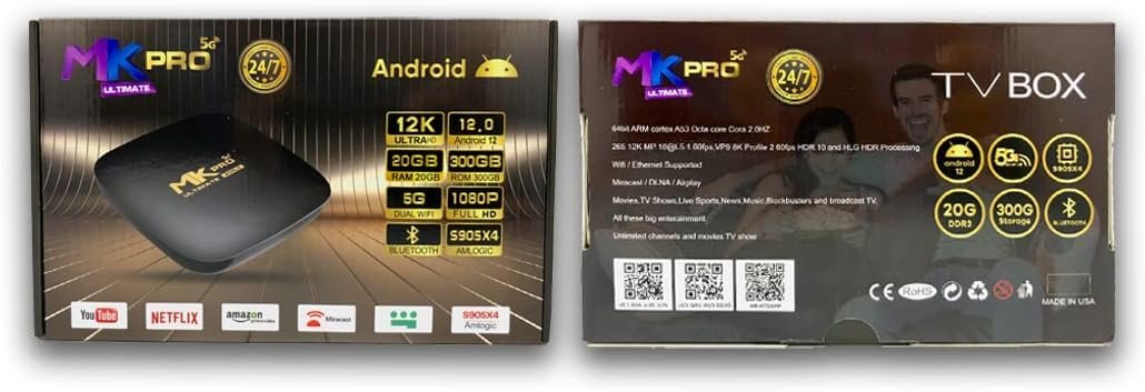 Android 11 MK Pro Ultimate 5G, 2.4G Box 20 GB RAM, 300 GB Memory, Smart UHD TV Box Home Cinema a multi-media smart TV for live TV, video on demand, movies, and TV shows. With Android TV Box, Live TV Online, Online VOD, Live Football, Cricket Movies, TV Series Music, and much more, you can make your TV smart. Phone 10 2GB DDR3 RAM MEMORY: 16GB Flash ROM WIFI: 2.4G/5G LAN: 100M USB 3.0 GPU: CORE Mali-450 4.0 BT EMMC Design, H.265 HEVC Misc. – IR sensor 4CORE CPU: 64BIT TV Box AV output, HDMI 1.4 video output HDMI, AV, power adapter, remote control, and HDMI audio output Cable Local media playback, HDD, U disk, and SD card support Support English, Arabic, Japanese, Korean, and 24 other languages are all spoken.