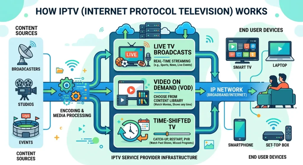 In the old days, your TV signal arrived via an antenna (terrestrial), a satellite dish on your roof, or a cable buried underground. IPTV is different. It delivers television content through your internet connection.
